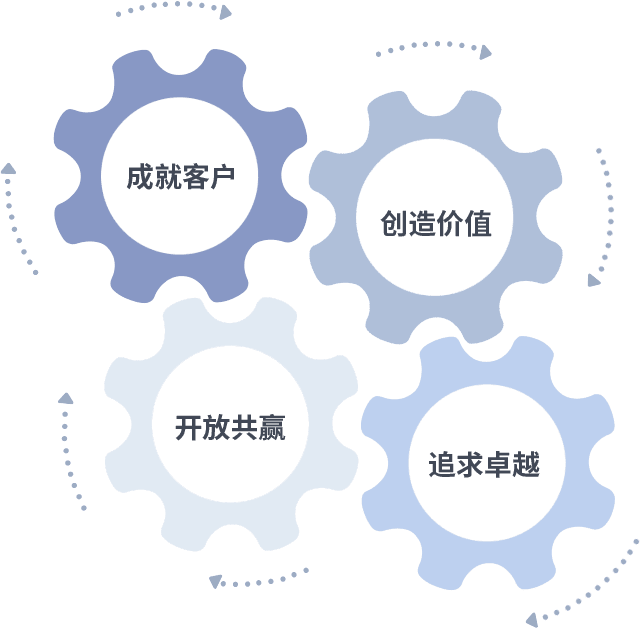成就客户是一切决策的出发点,,,创造价值是衡量所有工作的标准,,,追求卓越是我们做事做人的态度,,,,开放共赢是我们的格局也是最终的结果。。。。价值观的齿轮环环相扣,,,推动着组织里的每个人不断向前。。。