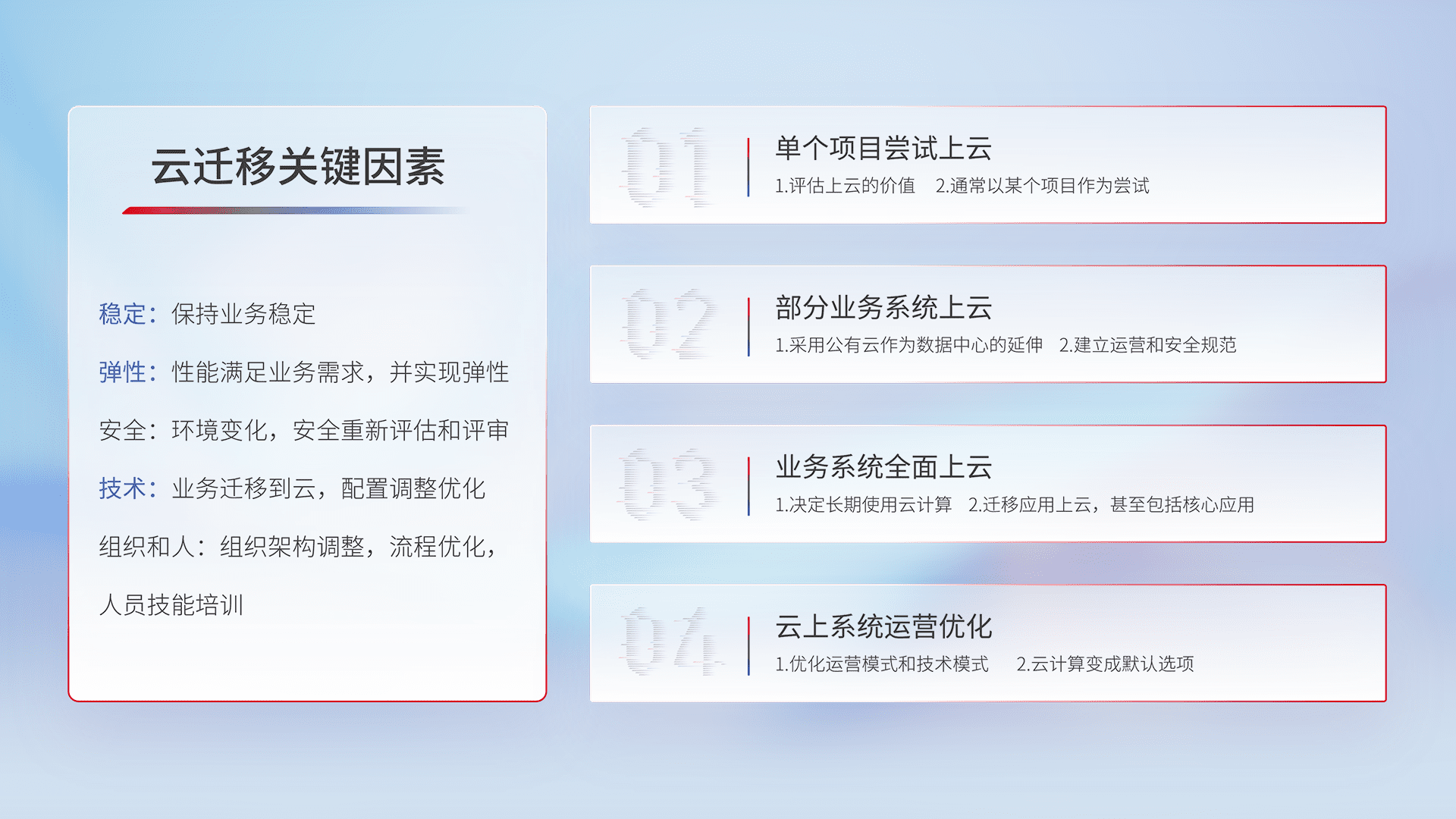 结合实际业务,,,从规划设计、、、、云平台选型、、、云原生改造、、、数据迁移、、、、集成交付,,迁移全过程为客户识别最佳上云路径,,做好风险识别管理,,设计网络架构、、身份权限、、、安全审计合规、、、操作审计、、、、日志审计、、、、监控告警策略、、多站点容灾设计等,,,,对云上基础设施进行整体规划,,,,提升IT治理水平,,以满足弹性、、、、高可用、、、、高性能的需求。。。
